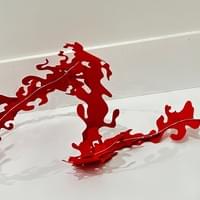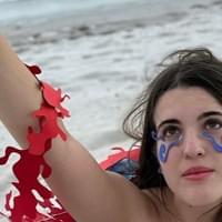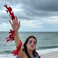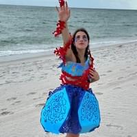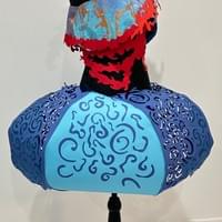 Balsa de mi Sangre is based on the perilous journey of illegal immigration across the Caribbean Sea. The rounded shape of the skirt resembles an inflatable raft, adorned with swirling cutouts. As light filters through the skirt, an intricate interplay of overlapping light and shadow emerges, creating the illusion of a sea within the piece itself. The scarlet armpiece encircling the wearer’s limb was designed with the idea of salvation in mind; many Cubans risk their lives crossing the ocean in search of a better life in the United States. In my research, I noted how many people raised their hands toward the sky, as if trying to grasp it. I wanted the encirclement around the outstretched hand to capture the struggle—the fight for a new beginning.