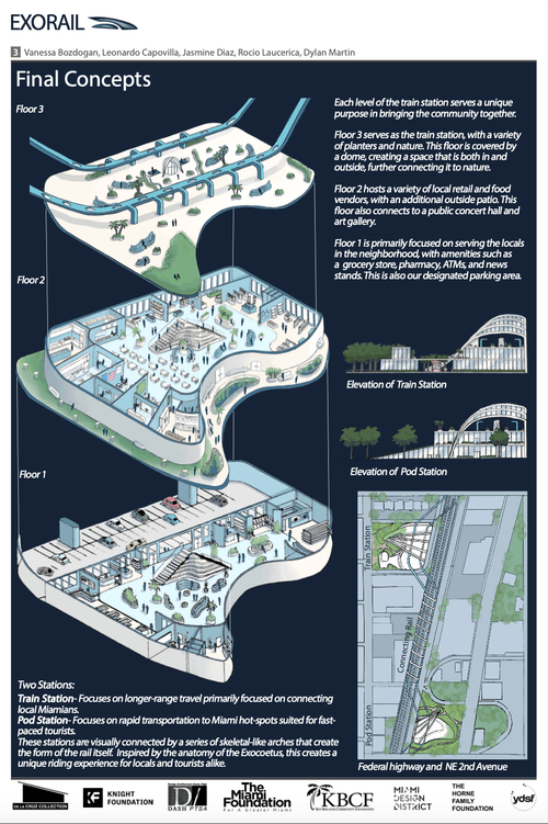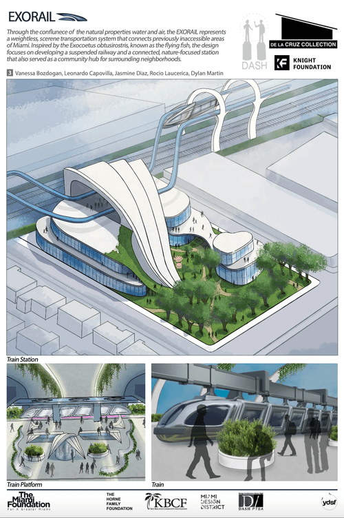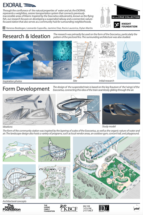 Through the confluence of the natural properties water and air, EXORAIL represents a weightless, serene transportation system that connects previously inaccessible areas of Miami. Inspired by the Exocoetidae, also known as the flying fish, the design focuses on developing a suspended railway and a connected nature-focused station that also serves as a community hub for surrounding areas.