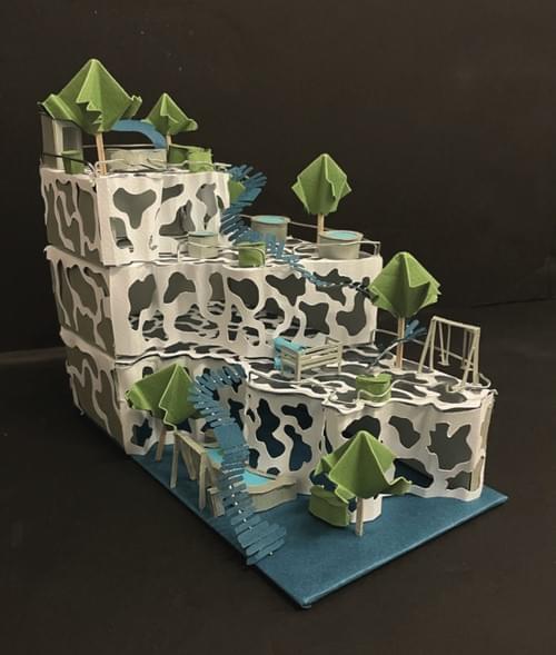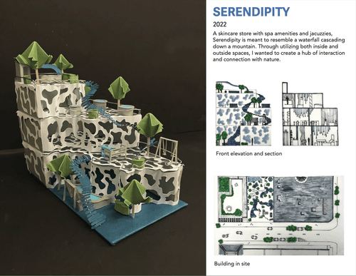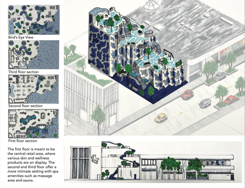 Through a seamless marriage between indoor and outdoor areas, SERENDIPITY doubles as a skincare/spa service as well as a park and landscape area for the Miami Design District. The design with its receding layering and blue stairs is meant to resemble a waterfall cascading down a mountain, recalling images of relaxation in an otherwise busy area. Through utilizing both inside and outside areas of the building, there is an innate hub of interaction and connection with nature.